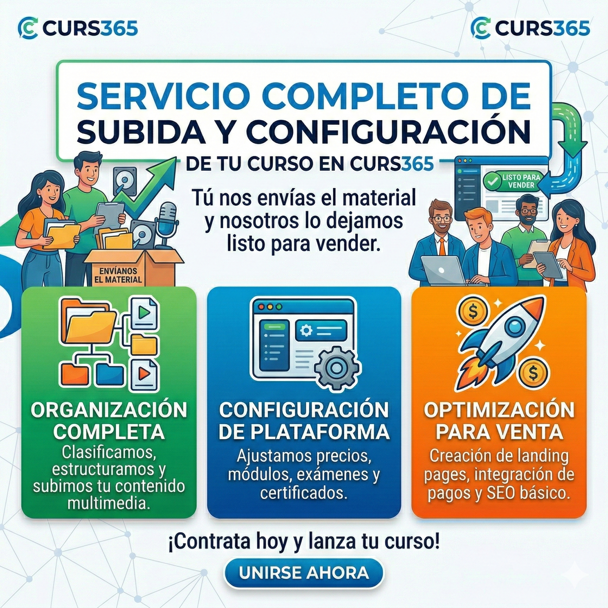 En CURS365 queremos que impartir tu curso sea fácil y rápido. Si no tienes tiempo o prefieres que un profesional lo haga por ti, nosotros nos encargamos de subir, organizar y dejar tu curso completamente listo para vender.